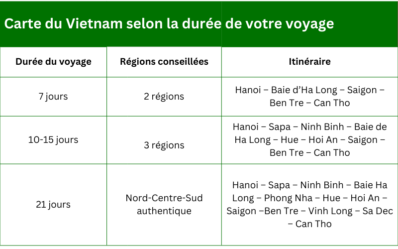Comment lire la carte du Vietnam pour un itinéraire sur mesure ? Voici un tableau simple: