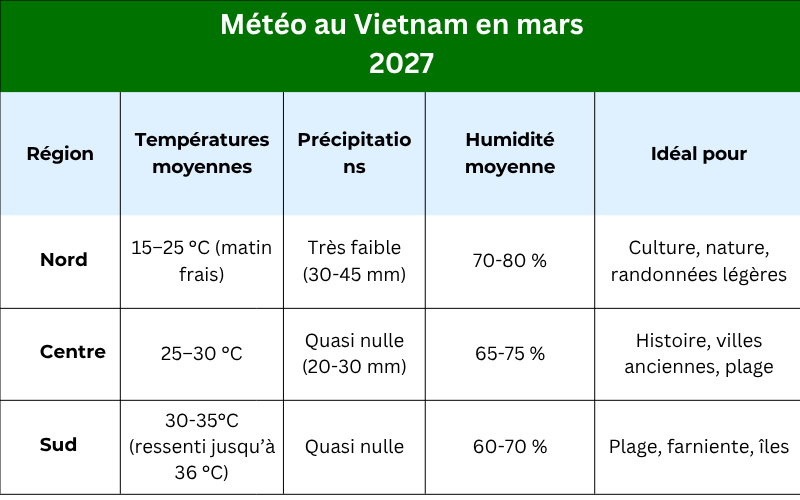 Cependant, il faut nuancer. Beaucoup de voyageurs imaginent un climat uniforme dans tout le pays. Or, en mars, la météo peut être très différente entre Hanoi, Hué et Ho Chi Minh-Ville.