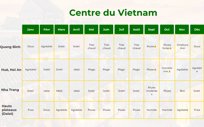 Le centre du Vietnam possède une configuration particulière : une bande de terre étroite entre mer et montagnes, avec un littoral très étendu. Il est donc souvent plus contrasté et parfois moins prévisible que dans le nord ou le sud.