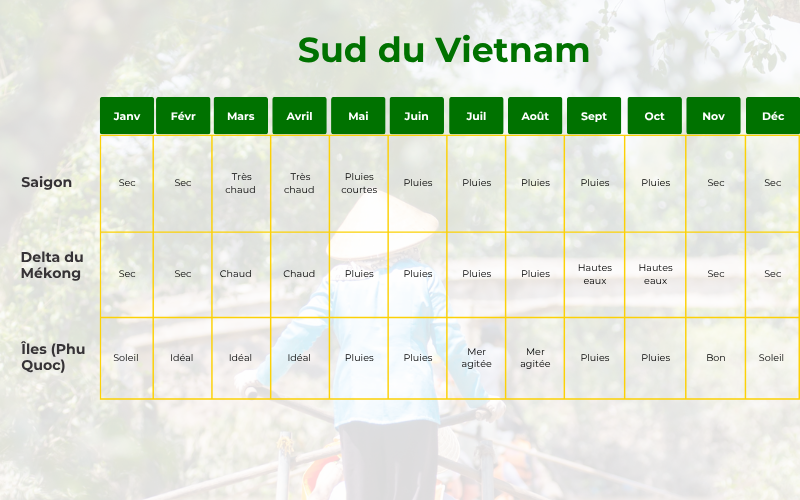 Le sud du Vietnam bénéficie d’un climat tropical relativement stable, avec deux saisons bien distinctes : une saison sèche et une saison des pluies.