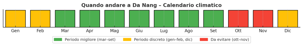 Il clima di Da Nang è di tipo tropicale, con due stagioni principali: la secca e la piovosa. Scegliere bene il periodo è fondamentale per vivere al meglio le spiagge e le escursioni.