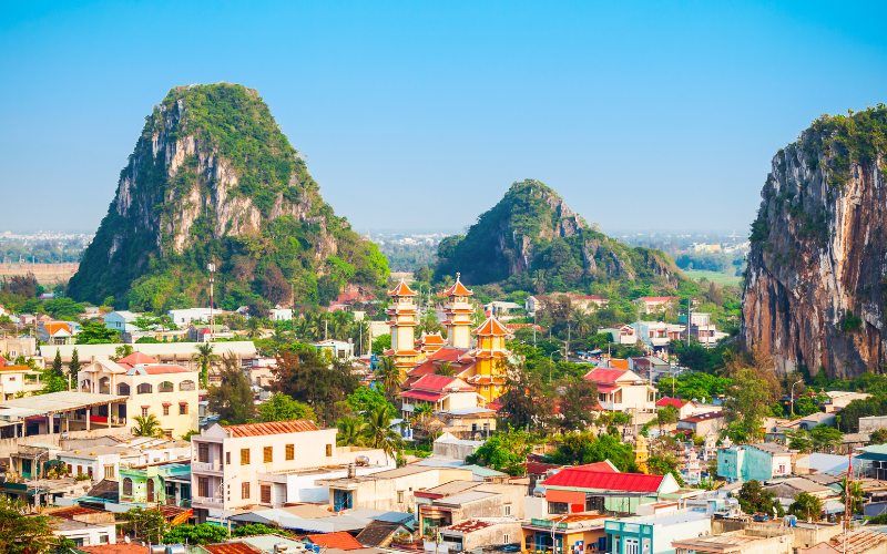 Le cinque montagne, ognuna dedicata a un elemento (Metallo, Legno, Acqua, Fuoco e Terra), emergono come isole di marmo e calcare tra la pianura e il mare.La più visitata è Thuy Son, la “Montagna dell’Acqua”, famosa per le sue grotte sacre, pagode antiche e punti panoramici che offrono una vista spettacolare su tutta Da Nang.